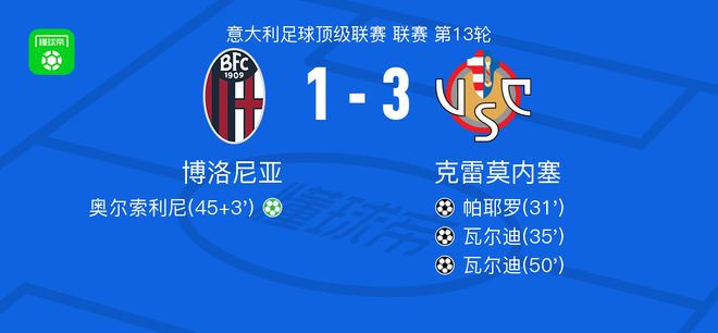 克雷莫内塞3-1博洛尼亚,瓦尔迪梅开二度,帕耶罗破门